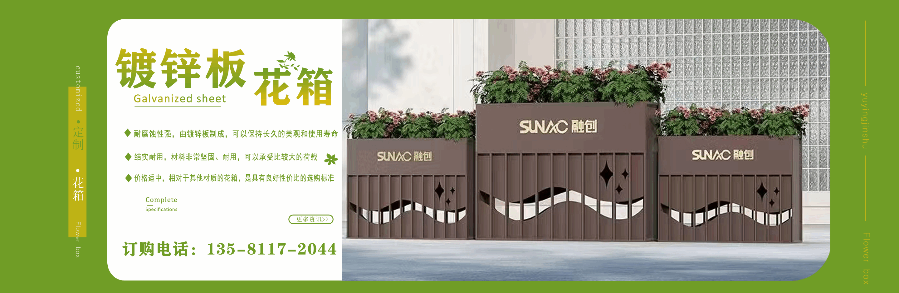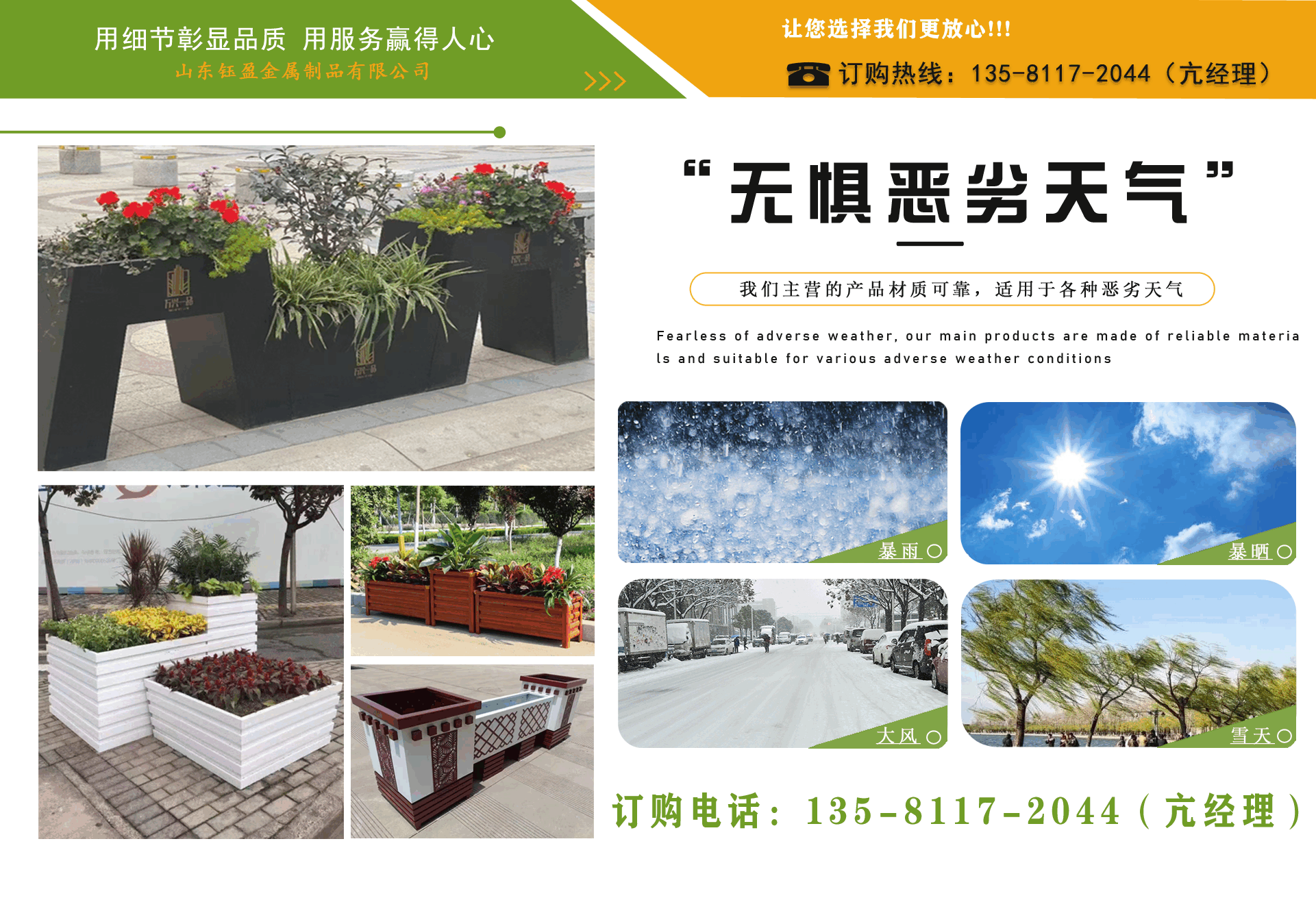 山東鈺盈金屬制品有限公司主營鍍鋅板花箱,道路隔斷花箱,定制花箱,戶外道路花箱,花箱座椅等產品,產品結構合理、性能優良,具有強度高、耐腐蝕、抗老化、隔熱隔音、節約能源、外形美觀、使用壽命長等優點,深受國內外客戶認可?! ∥覀兏鶕蛻羲诔鞘械奈幕卣鳎圃斐龇袭數爻鞘形幕瘹庀⒌淖匀涣Ⅲw、觀賞性強的花箱產品成為城市里一道靚麗的風景線?! 」緦嵭姓\實、公正、守信、價格合理、平等互利?! 」緫{借雄厚經驗實力,恪守誠信為本的原則,得到了眾多客戶的信賴,并在業界獲得良好的口碑。建立了穩固的合作關系,隨著業務的不斷發展和壯大,合作伙伴的范圍也在不斷擴大。我們熱情盼望與您的合作,為社會的可持續發展獻上一份努力。...